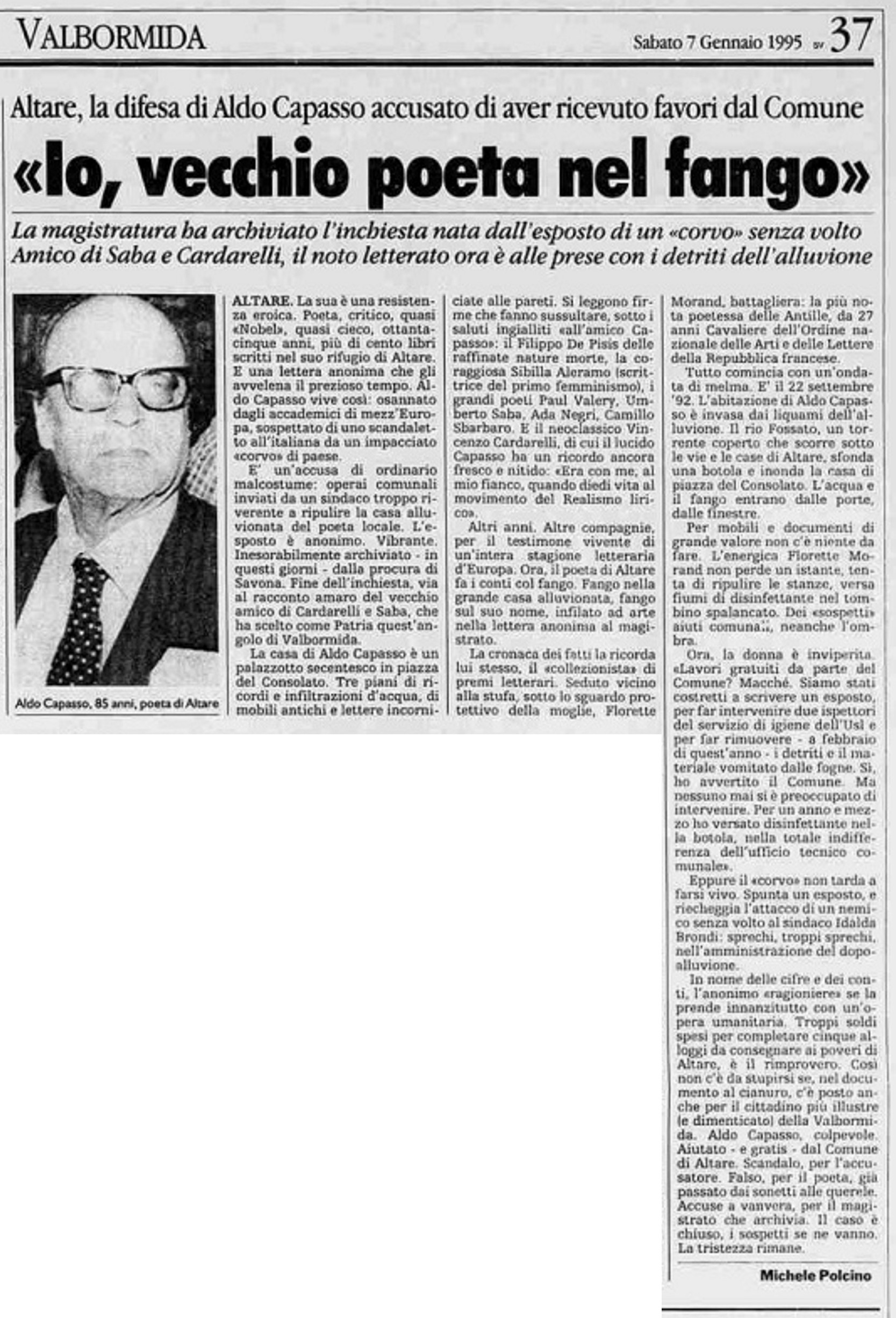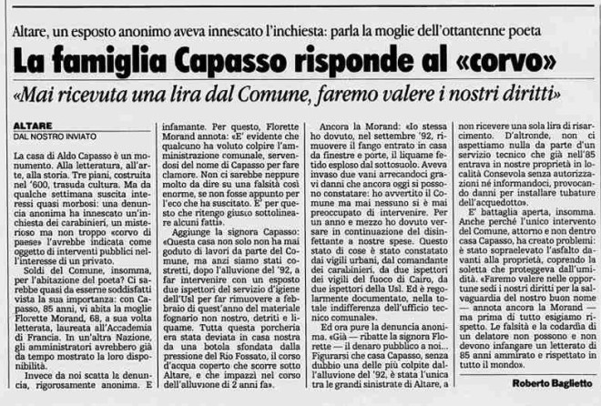 Purtroppo, Aldo Capasso, ormai anziano e debilitato, ebbe il dispiacere di avere la villa di famiglia alluvionata il 22 settembre 1992, e di venir pubblicamente offeso da un esposto anonimo di un "corvo", che lo enunciava come beneficiario di favori e risarcimenti in denaro da parte del Comune.