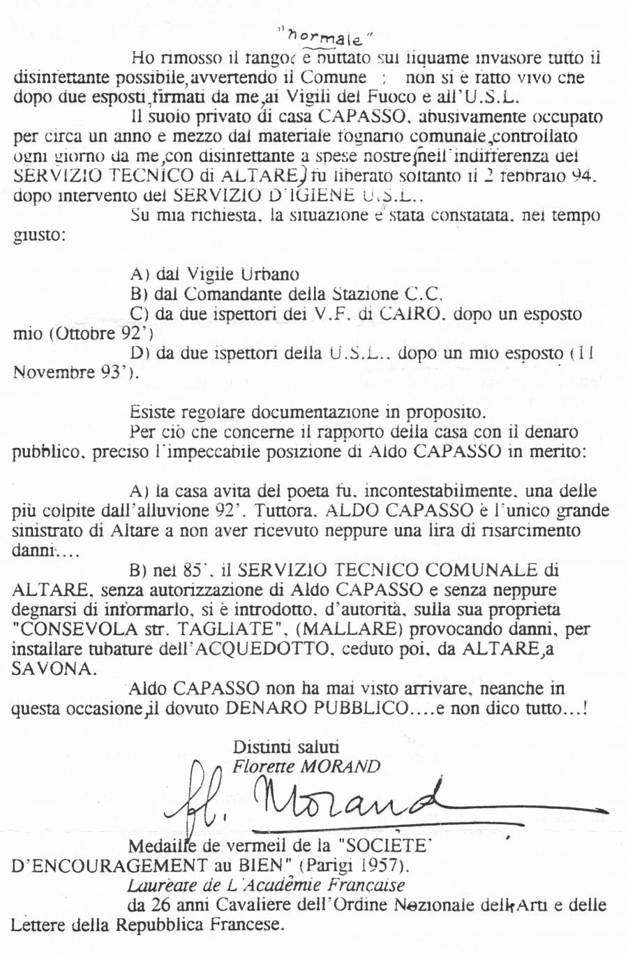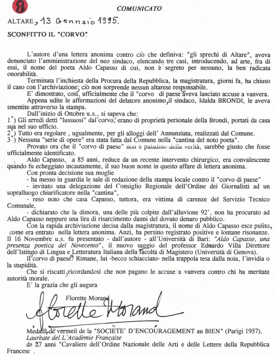 Alle insinuazioni di un "corvo" che aveva usato il cognome Capasso, quale uno dei fruitori di privilegi e denaro per i danni dell'alluvione del 1992, per il caso "gli sprechi di Altare", ne documenta la completa attivazione a proprie spese, nonché dà l'annuncio scritto con soddisfazione di archiviazione dell'inchiesta della Procura,